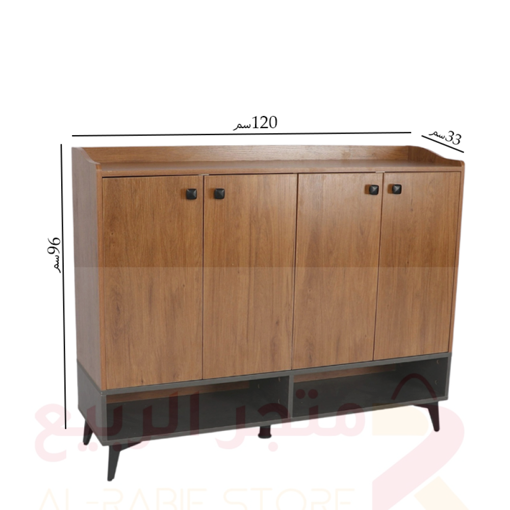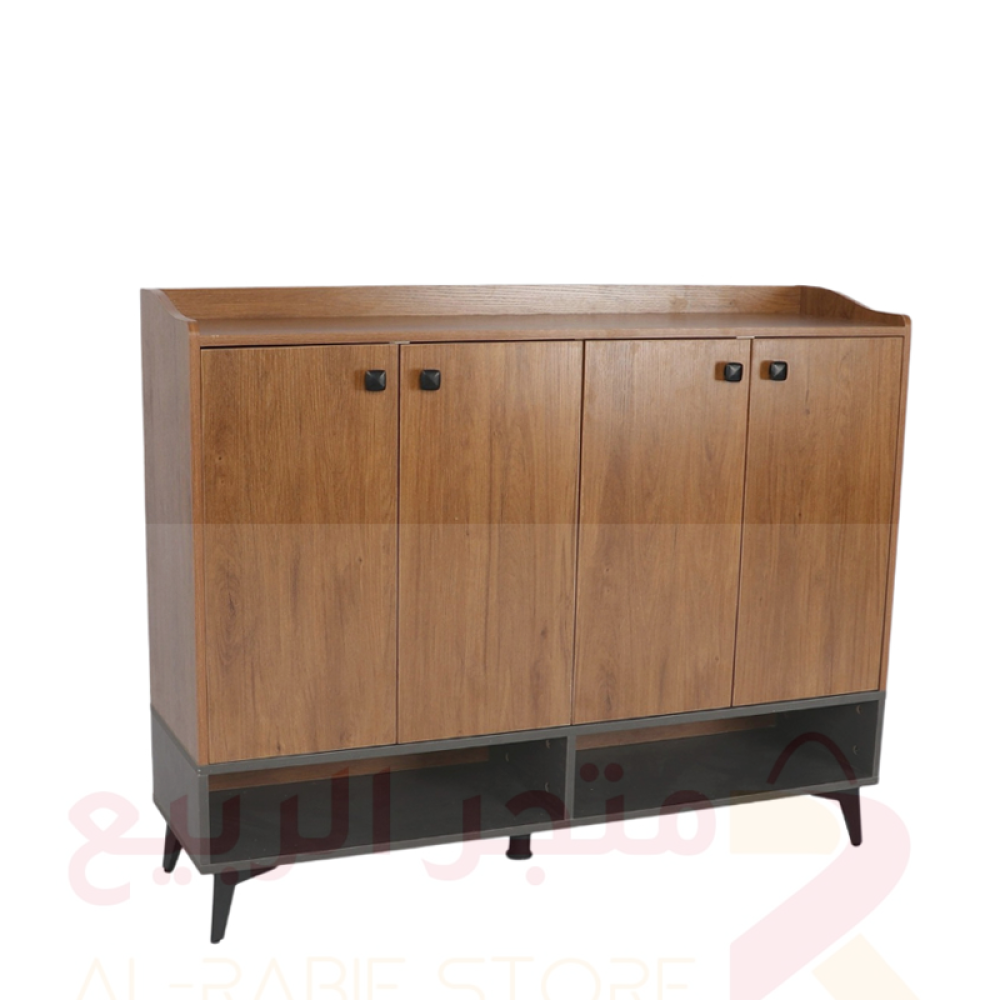 الجزء العلوي عبارة عن خزانة بأربعة أبواب عمودية لتخزين الأحذية، بينما الجزء السفلي يحتوي على رف مفتوح مقسوم إلى مساحتين للتخزين أو العرض.