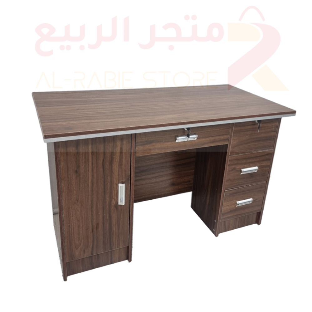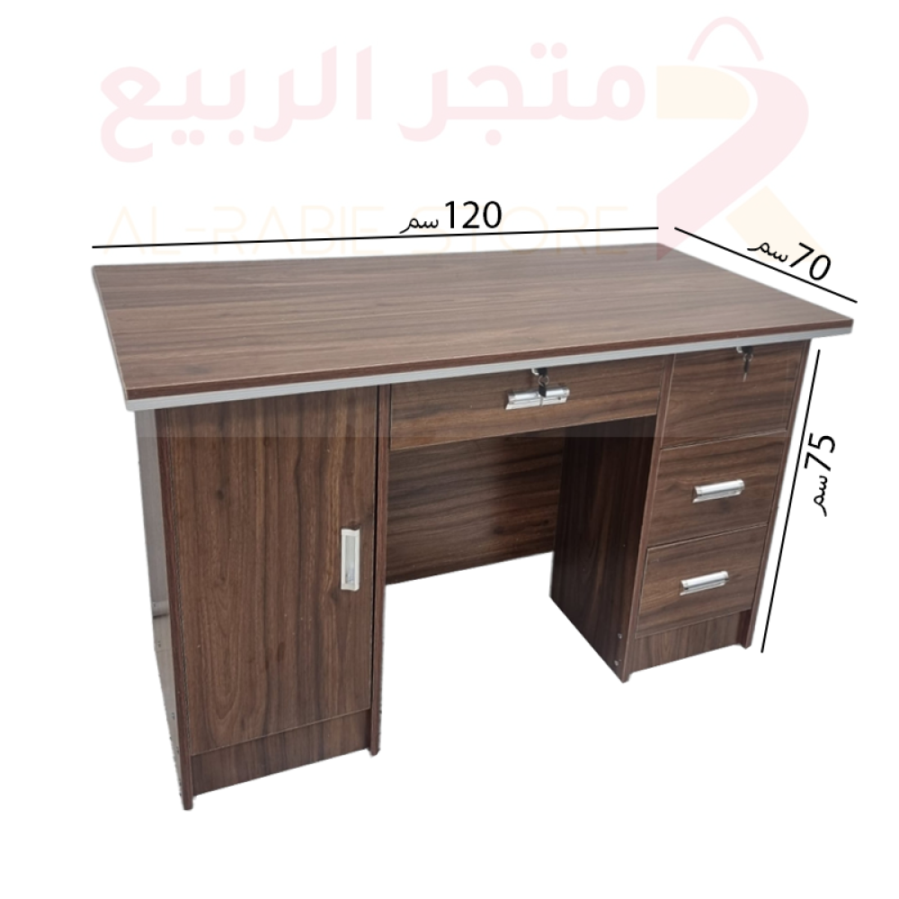 طاولة مكتب أنيقة مصنوعة من الخشب بلون بني داكن، تتميز بالمتانة والتصميم العملي، مما يجعلها مثالية لمكاتب العمل أو الدراسة.