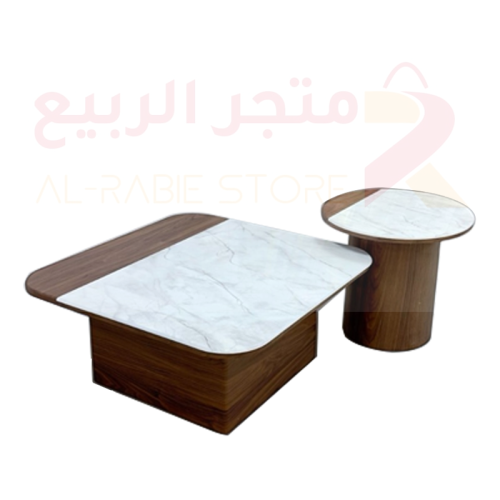 طقم طاولات تقديم أنيق يتكوّن من طاولتين متكاملتين بتصميم نصف رخامي ونصف خشبي، يمنح الطقم توازنًا بصريًا مميزًا ويضفي لمسة عصرية راقية على ديكور المكان.